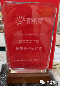 2020年1月申江萬(wàn)國數據信息股份有限公司(以下簡(jiǎn)稱(chēng):申江萬(wàn)國)榮獲合作客戶(hù)光大銀行信用卡中心頒發(fā)的2020年度“最佳合作伙伴獎”。